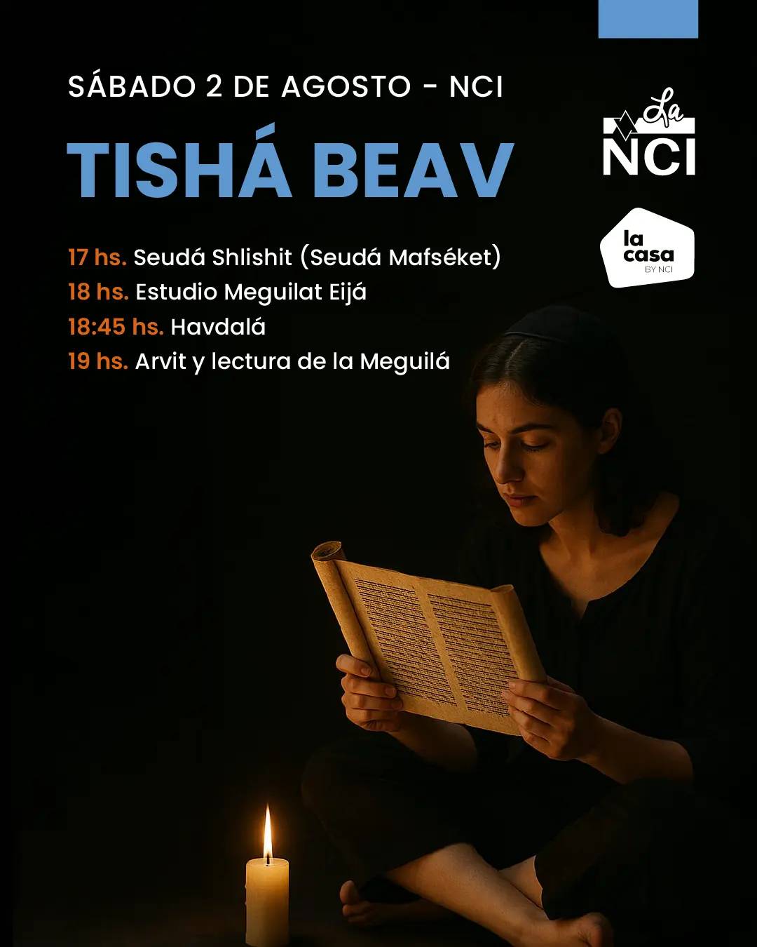 Los esperamos este sábado 2 de agosto a las 17 hs para hacer Seudá Shlishit, terminando juntos Shabat y para dar comienzo a la noche de Tishá BeAv con la tefilá de Arvit y la lectura de la Meguilá.